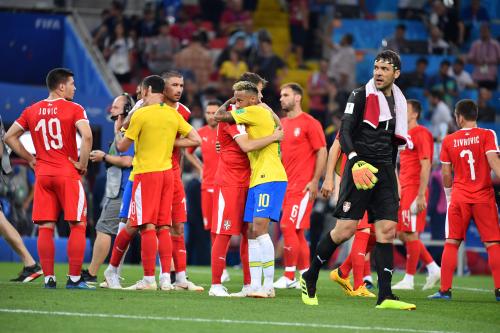 在莫斯科,不敌巴西的塞尔维亚人悲情出局,门将斯托伊科维奇走向场地中央,与获胜的巴西球员拥抱。擦肩而过的瞬间,他扭头望着对手,满眼是不舍和眷恋。